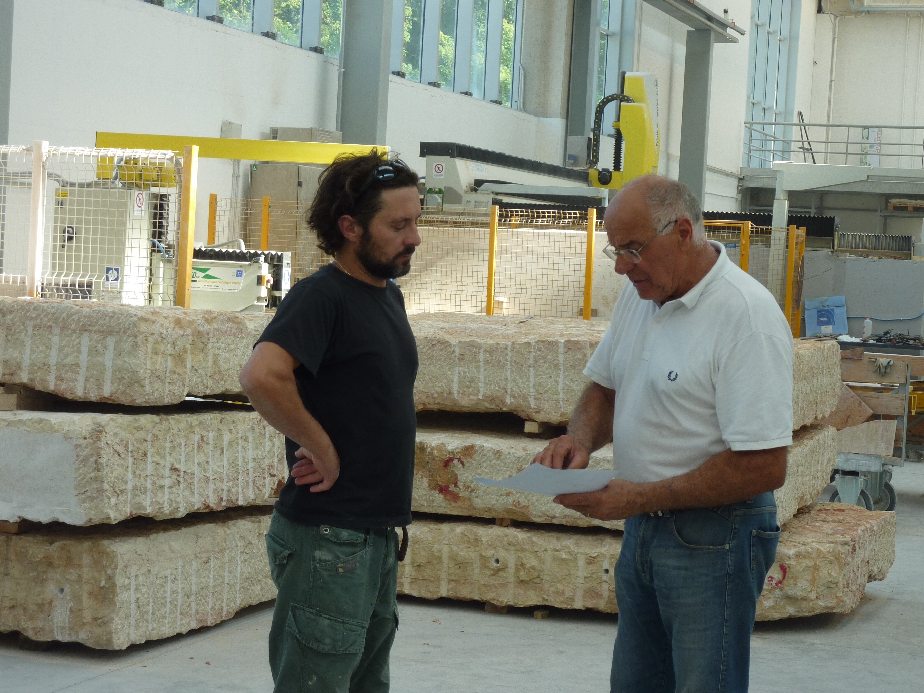 Il materiale è stato scelto direttamente in cava, in base alla qualità e agli spessori, eseguendo parte del lavoro in loco, con scalpelli direttamente sulla pietra, lasciando sui blocchi i segni dell’estrazione, eseguita con mezzi meccanici. Nella fase di composizione della base è stato eseguito un lavoro manuale di subbiatura delle facce a vista.