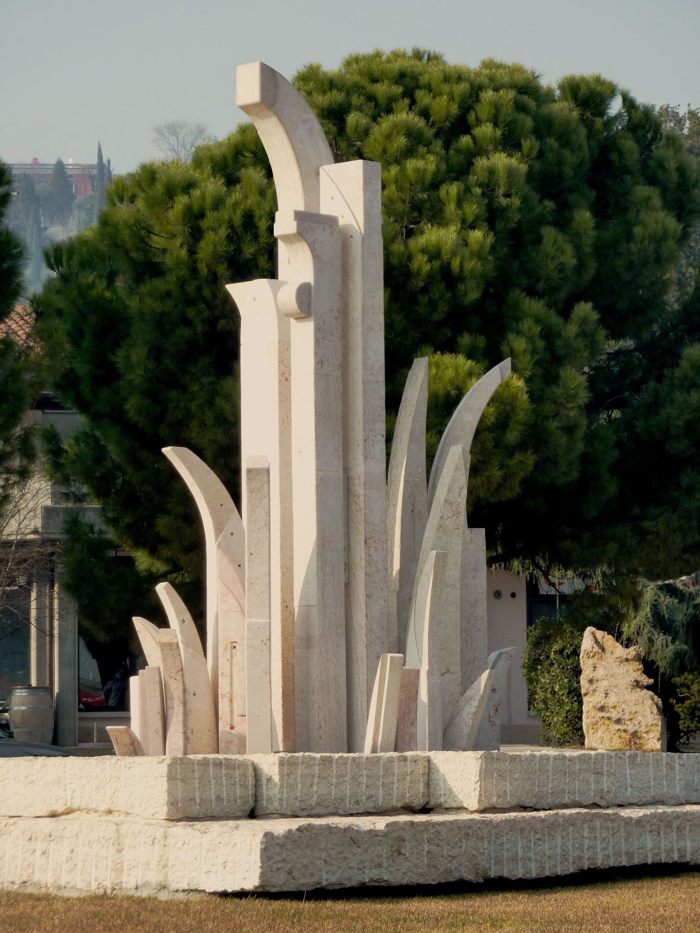 Formata da vari elementi in pietra locale, l’opera prende spunto dalla tradizione e dalla storia del territorio ambrosiano, fortemente legata alle vicende delle sue cave e dei suoi laboratori. Da qui la scelta di portare al centro del paese l’elemento cava, per ricordare il lavoro svolto per secoli da migliaia di ambrosiani.